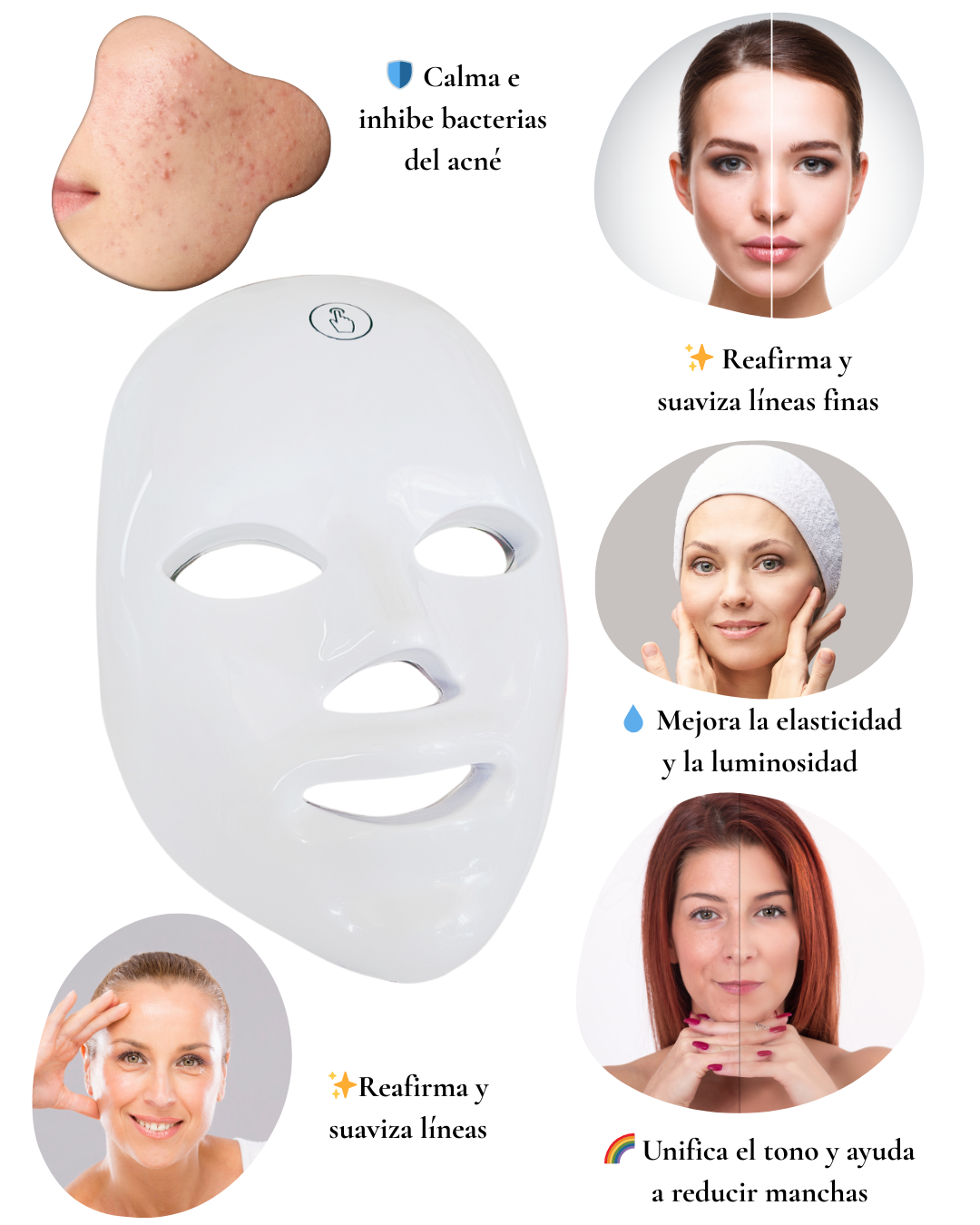✨ Rejuvenece tu piel en solo 15 minutos al día con la Máscara LED de 7 Colores: la misma tecnología que usan clínicas dermatológicas, ahora en tu casa. Reduce arrugas, combate el acné, unifica el tono y devuelve luminosidad a tu rostro con un tratamiento seguro, indoloro y clínicamente probado. Un solo dispositivo, múltiples beneficios visibles desde las primeras semanas.